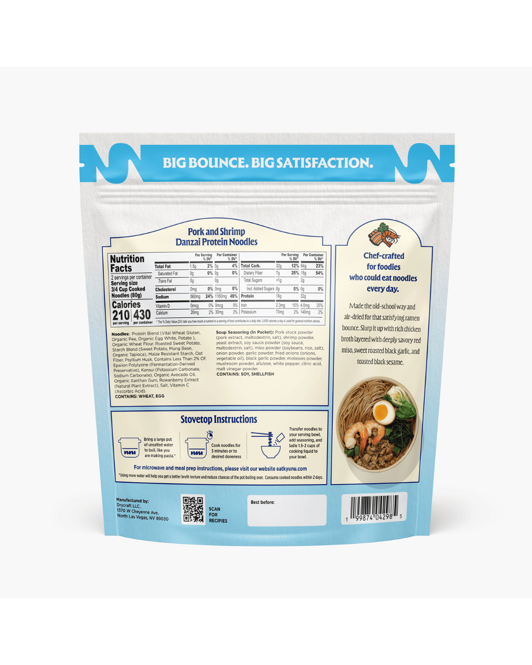 Restaurant-quality instant noodles that don't suck. Our Taiwanese Pork & Shrimp Danzai brings a legendary Tainan street food straight to your kitchen. This unapologetically authentic soup delivers rich, porky depth enhanced with umami shrimp notes and the perfect hint of sweetness from fried shallots. You'll love slurping it up with our signature protein ramen noodles that deliver a deliciously bouncy "QQ" texture (that's Taiwanese for "damn good chew").